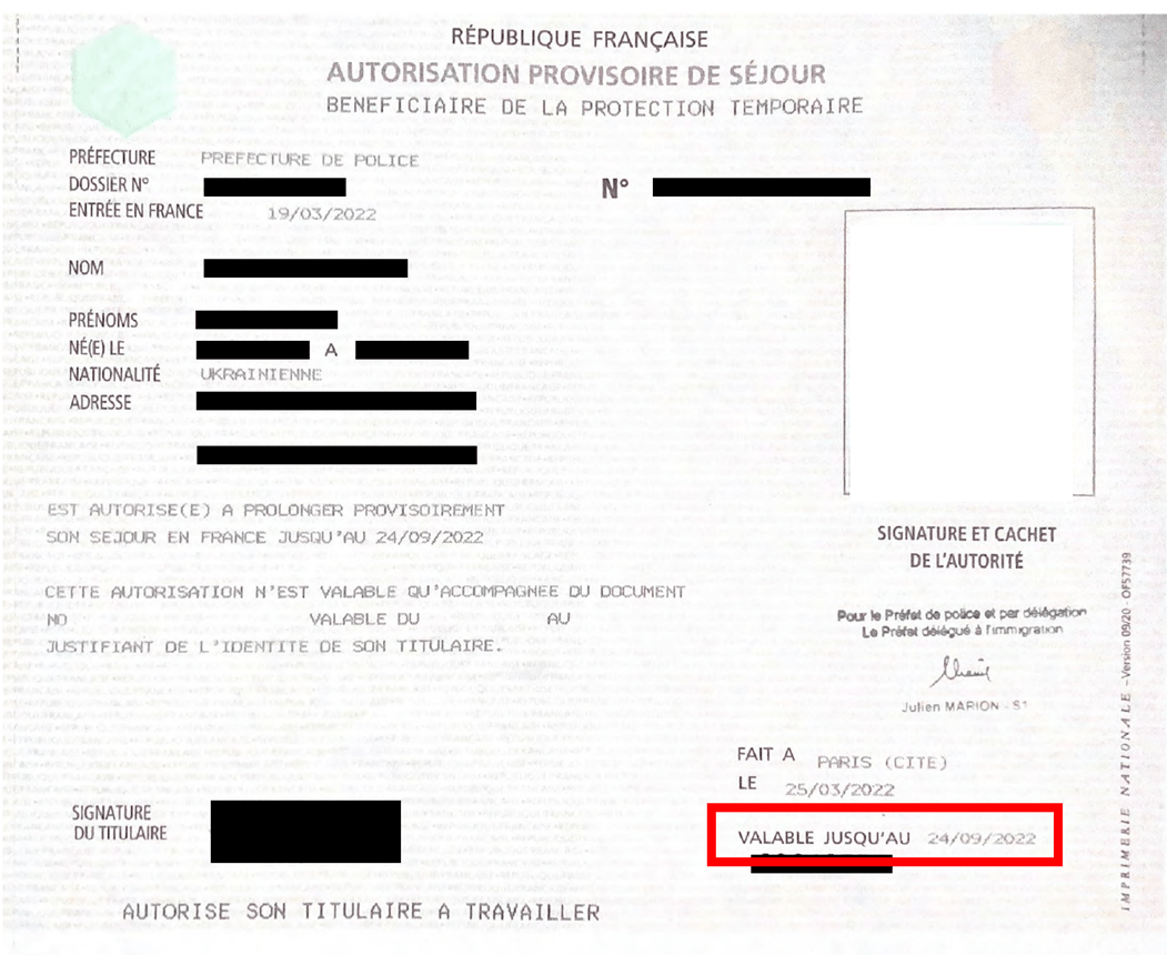 - A copy of the new valid temporary residence permit for all adult family members; If you have earned money in France, proof of all the resources received (salary slips, various aids, etc.) ; A dated and signed form. This form is available at this link (in French and Ukrainian).